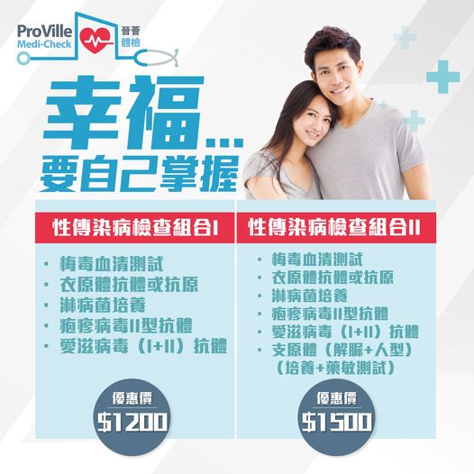 幸福要自己掌握,健康更加要!擔心開心過後會中招?Proville Medi-Check提供「性傳染病檢查組合」,更好保障自己和愛人的健康。目前「性傳染病檢查組合I」價錢$1200,「性傳染病檢查組合II」只需$1500!